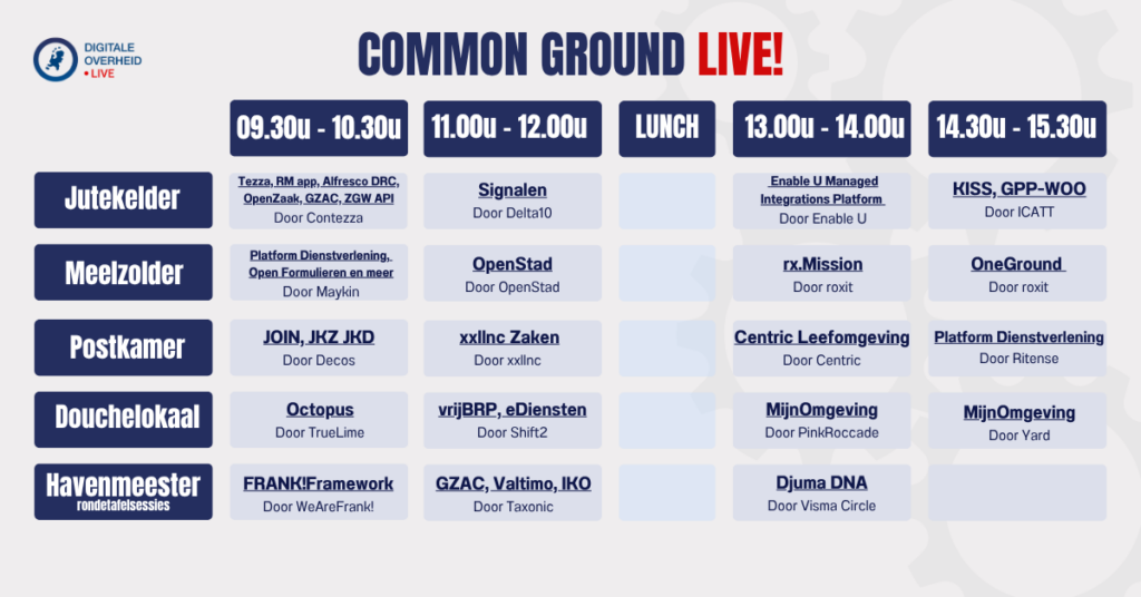 Bekijk hieronder het programma voor Common Ground LIVE! Ontdek tijdens dit evenement alles over werkende oplossingen binnen de Common Ground beweging. Neem deel aan demonstraties van leveranciers of ga in gesprek tijdens één van de rondetafelsessies.
