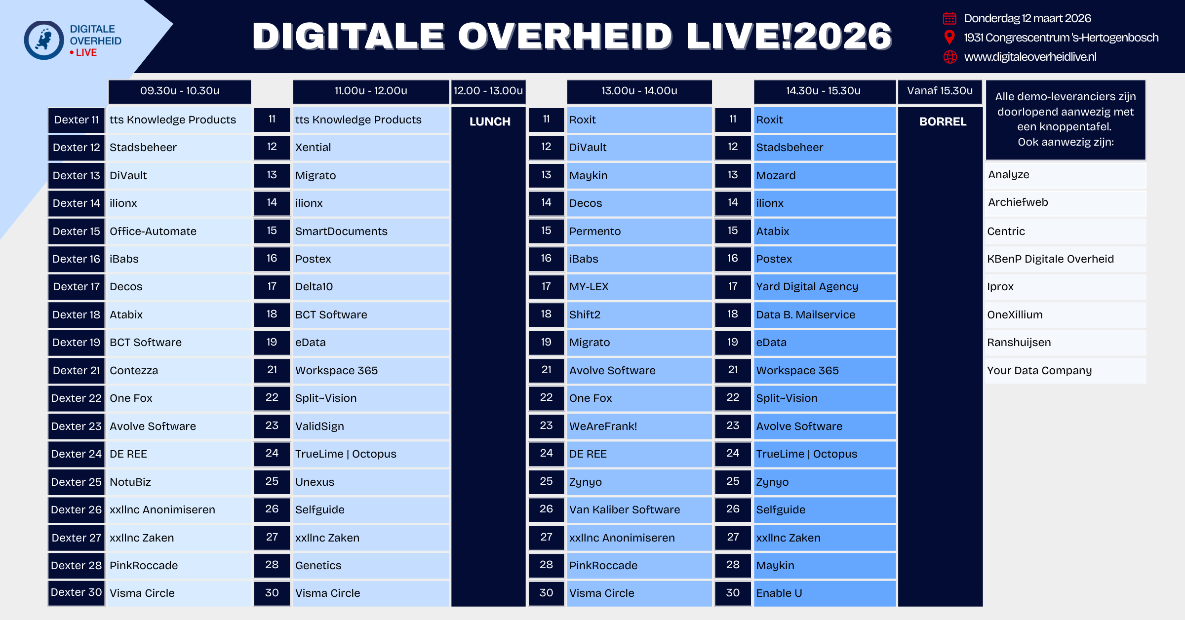 Tijdens LIVE! draait het om zien, beleven en ervaren van overheidssoftware. Leveranciers demonstreren hun software live, en je kunt in gesprek aan de knoppentafels om te ontdekken hoe hun oplossingen jouw organisatie verder kunnen helpen.